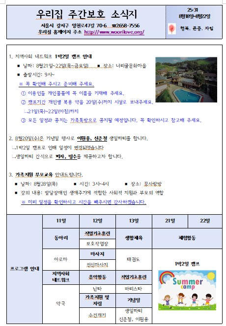¿ì¸®Áý Àå¾ÖÀÎ ÁÖ°£ ´Ü±âº¸È£½Ã¼³¿¡ ¿À½Å°ÍÀ» ȯ¿µÇÕ´Ï´Ù.